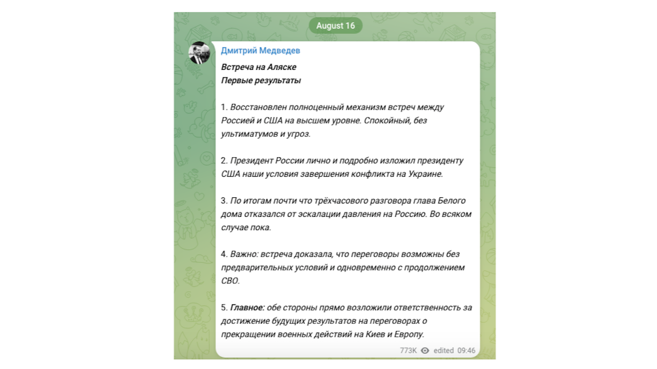 Това кратко мнение Медведев изрази в пост в социалните мрежи. В него той казва, че двете страни в разговорите в Аляска пряко са възложили отговорността на Украйна и Европа за постигането на бъдещи резултати в преговорите за прекратяване на военните действия.