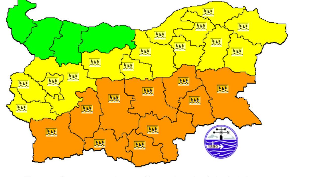 Жълт и оранжев код за значителни валежи издаде за днес Националният институт по метеорология и хидрология за почти цялата страна.
