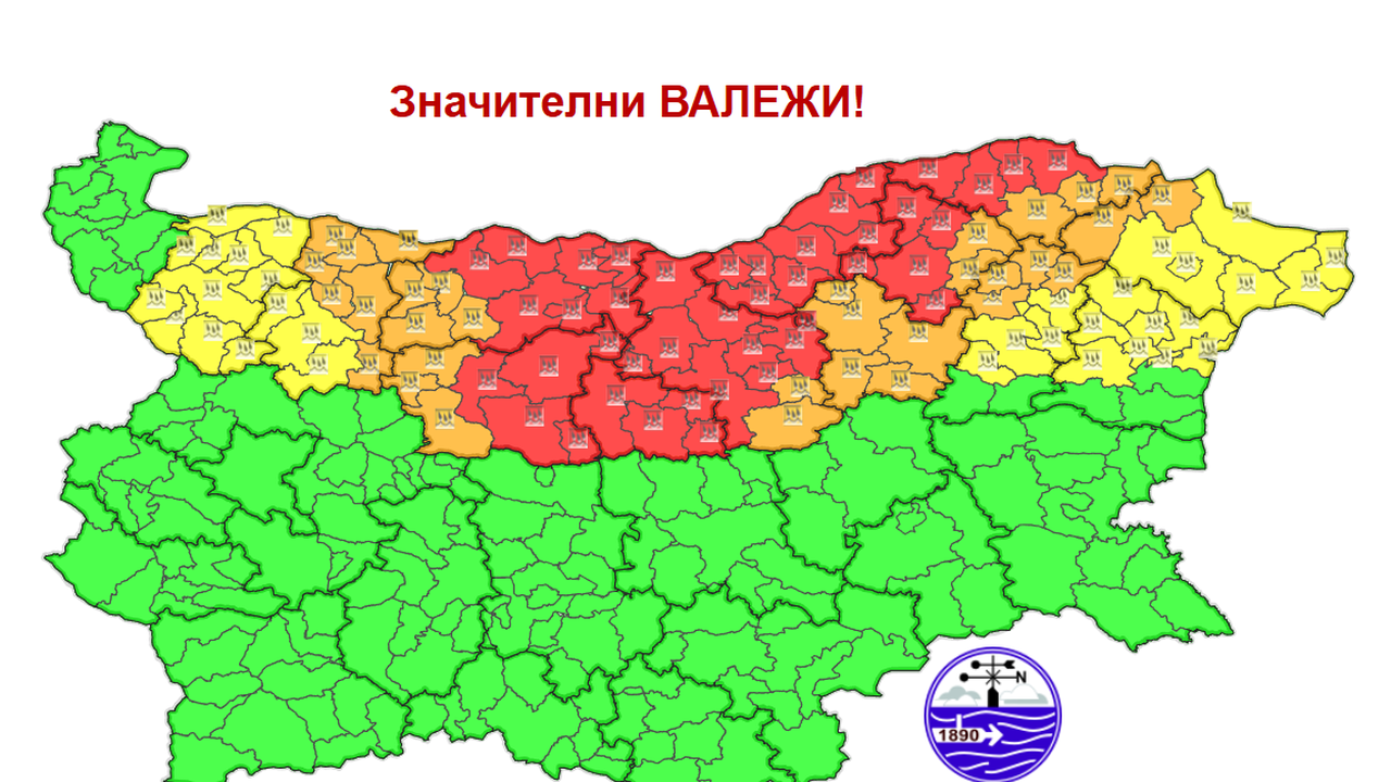 Оранжев код за значителни валежи е в сила за днес в областите: Враца, Търговище и Добрич. Предупредителен жълт код за значителни валежи е в сила в областите: Монтана, Варна и Шумен.