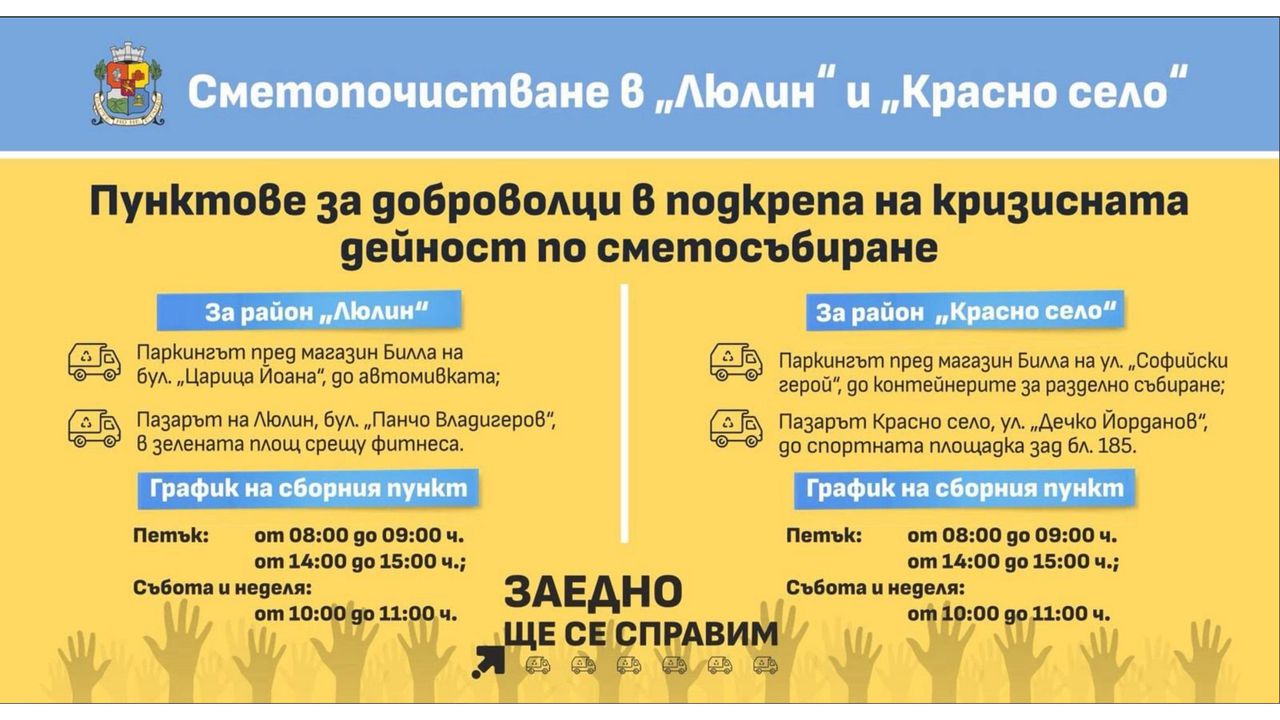 Във връзка с проявения висок обществен интерес и множеството запитвания от граждани, изразили готовност да се включат в дейностите по сметосъбиране, Столичната община създава организация за участие на доброволци в текущата кризисна операция по почистване на районите „Люлин“ и „Красно село“.
